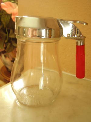 Title (ebay affiliate link): DripOut Glass Syrup Pitcher !930s Red Handle Chrome Top