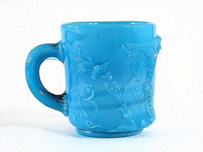 Title (ebay affiliate link): Vallerysthal Portieux Dark Blue Milk Glass Mug Cameo with Angel or Cherub