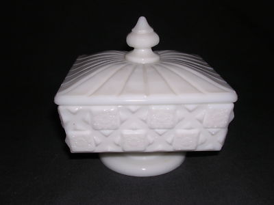 Title (ebay affiliate link): VINTAGE WESTMORELAND QUILT SQUARE MILK GLASS COMPOTE WITH LID