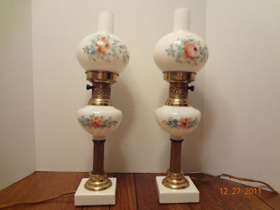 PAIR OF VERY OLD HANDPAINTED MILK GLASS DRESSER LAMPS