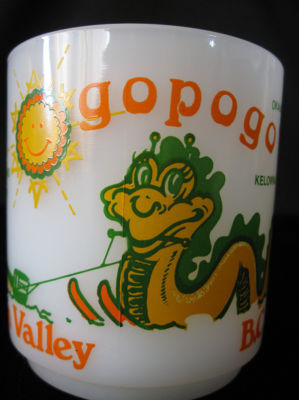 Title (ebay affiliate link): OGOPOGO MILK GLASS Glasbake COFFEE MUG Okanagan Lake Monster Souvenir Canada