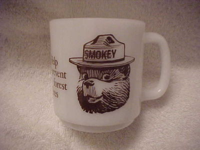VINTAGE GLASBAKE MILK GLASS "SMOKEY THE BEAR" MUG - MINT
