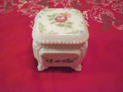 Title (ebay affiliate link): Vintage Westmoreland Beaded Milk Glass Lided Trinket Box Handpainted