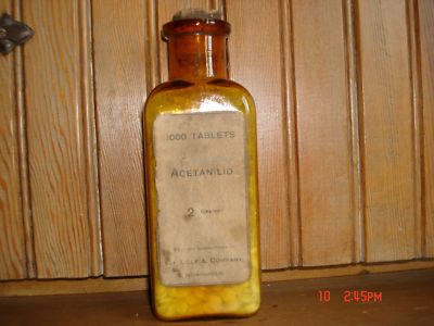 Title (ebay affiliate link): Antique Quack Medicine Bottle Eli Lilly Indianapolis Label Cork Acetanilid Pills
