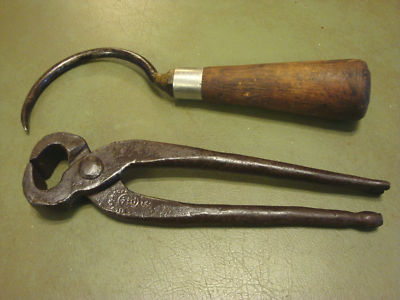 Heller Farrier Horse HOOF NIPPERS & Vintage Wood Handle HAY BAIL HOOK Ice Meat
