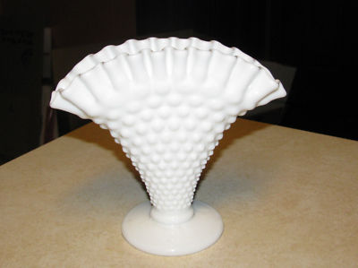 VINTAGE FENTON HOBNAIL FAN VASE CRIMPED RUFFLED RIM WHITE MILK GLASS