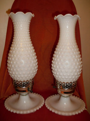 Title (ebay affiliate link): Vintage Milk Glass Hobnail Hurricane lamp light set-2 Nathan Lagin Company