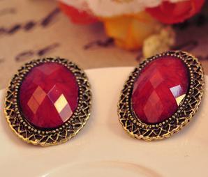 Vintage Oval Gem hollowout flower edge studded earrings red ruby antique stud