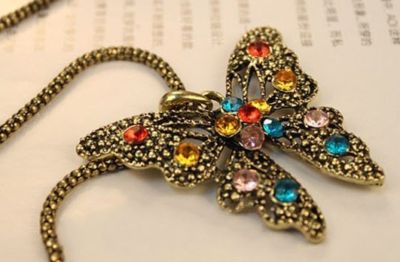 Title (ebay affiliate link): Antique Bronze Crystal Colorful Butterfly Necklace 30"