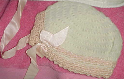 doll Antique DOLL HAT, PINK and WHITE CROCHET BONNET,RIBBONS
