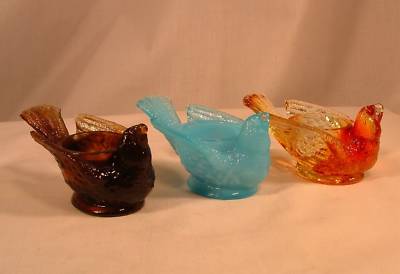 3 Degenhart Glass Bird Open Salt Dip Amberina Milk Blue