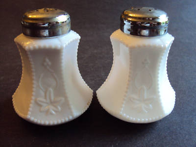 Milk Glass Salt & Pepper Shakers Beaded Leaf Design