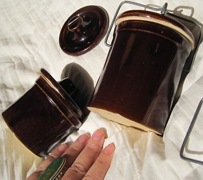 Title (ebay affiliate link): Hello my beauties, 2 vintage brown glazed crocks, for mid century kitchen fun!!!