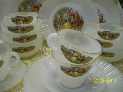 Title (ebay affiliate link): TERMOCRISA MILK GLASS DISHES LOT OF 16 PIECES VICTORIAN SCENE PLATES BOWLS CUPS