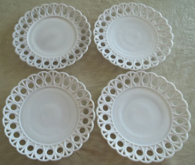 VINTAGE SET OF 4 MILK GLASS OPEN EDGES LACY PATTERN DINNER PLATES CHARGERS