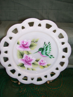 Title (ebay affiliate link): Handpainted / Crafted'' Hummingbird & Pink Roses '' Milk Glass Plate