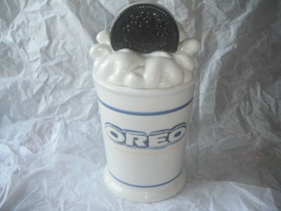 Title (ebay affiliate link): brand new unused OREO COOKIE JAR depicting glass of milk & dunking cookie CUTE !