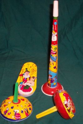 Title (ebay affiliate link): Vintage US Metal Toy Mfg Co - Horn with 3 Noise Makers Party Sceene Made in USA