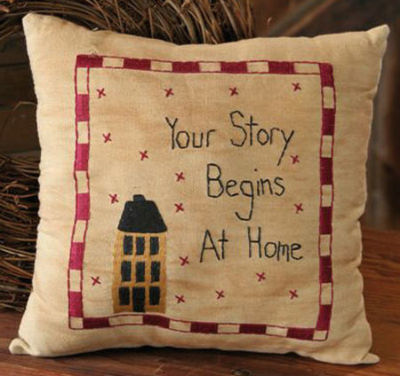 Title (ebay affiliate link): PRIMITIVE "YOUR STORY BEGINS AT HOME" PILLOW WITH SALT BOX HOUSE~NEW~