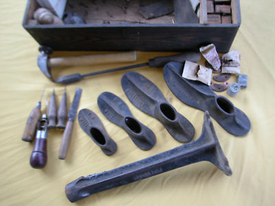 Title (ebay affiliate link): Antique Cobbler's Shoe Repair Box w/ Leather Tools Anvils Old Shoemaker Lathe