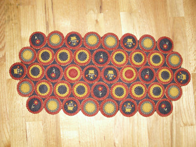 Title (ebay affiliate link): Primitive ***Completed ***Penny Rug table runner red/mustard/black Wool felt