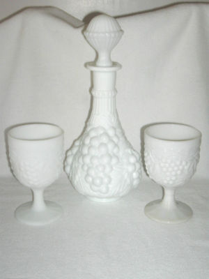 Title (ebay affiliate link): Imperial Glass Wine Decanter Carafe w/ 2 Stem Goblets Grape Vine in Milk Glass