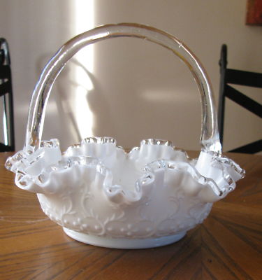 Title (ebay affiliate link): Milk White Glass Fenton Basket with Clear Handle and Ruffled Edges