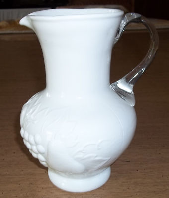 Title (ebay affiliate link): Vintage Milk Glass Tall Pitcher With Raised Fruit & Clear Applied Handle
