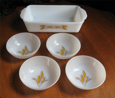 Vintage Set 4 WHEAT DESIGN Milk Glass Bowls & 1 Baking Anchor Hocking Fire King