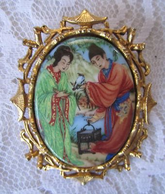 Title (ebay affiliate link): Vintage Cameo Style Brooch Oriental Motif Geisha Girl on Milk Glass Signed 'Art'