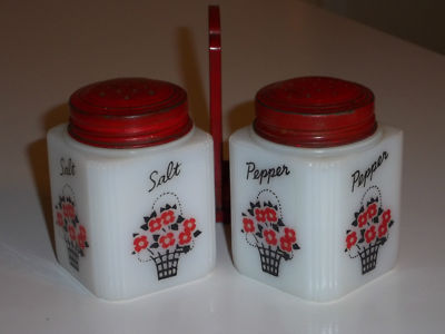 Title (ebay affiliate link): Vtg Tipp U.S.A. 4 Sided Milk Glass FLOWER BASKET Salt Pepper Shakers w/ Caddy