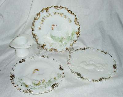 3 MILK GLASS ROOSTER CHICKEN DUCK EASTER PLATES & TOP HAT