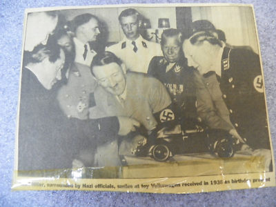 Title (ebay affiliate link): 1938 newspaper clipping of Hitler recieving TOY VOLKSWAGEN BEETLE