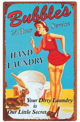 Title (ebay affiliate link): Vintage Tin Ad Sign Bubbles Laundry Service with Pin Up Gal