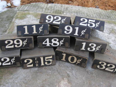 Title (ebay affiliate link): 11 Vintage 1920s General Store Tin Price Tag Displays Industrial Mecantile