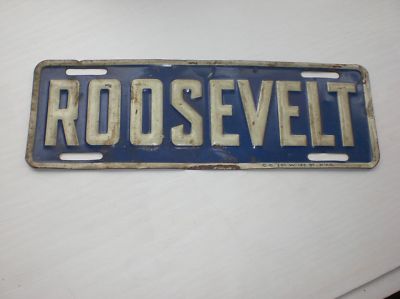 Title (ebay affiliate link): Vintage roosevelt license plat topper tin sign porcelain?