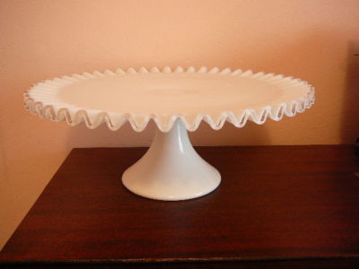 WHITE MILK GLASS PEDESTAL CAKE PLATE-CLEAR RUFFLED RIM