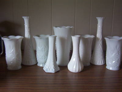 Lot 9 Vintage Milk Glass Vases Hobnail Swirl Star