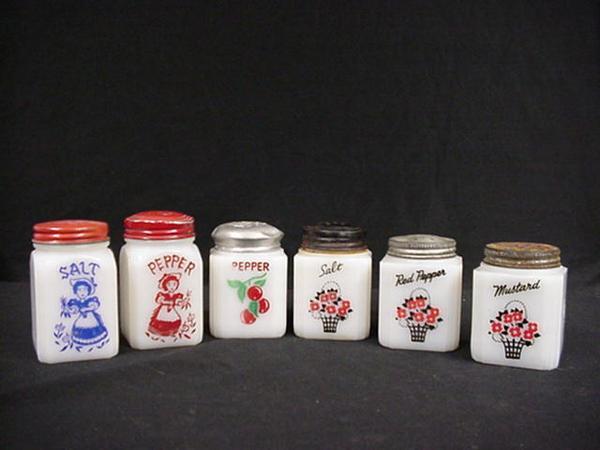 6 TIPP MILK GLASS BASKET CHERRIES SHAKERS SALT PEPPER