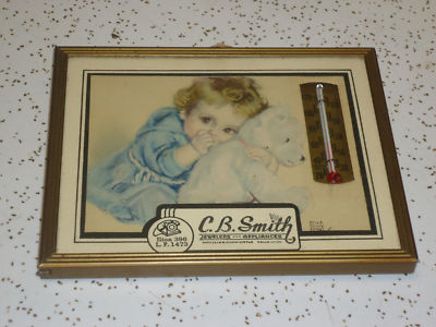 VTG 40'S C.B.SMITH ILION N Y ADVERTISING THERMOMETER W/PIC CHILD & TEDDY BEAR