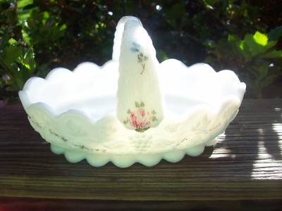 WESTMORELAND.MILK GLASS BASKET.GRAPE W/ PAINTED FLOWERS