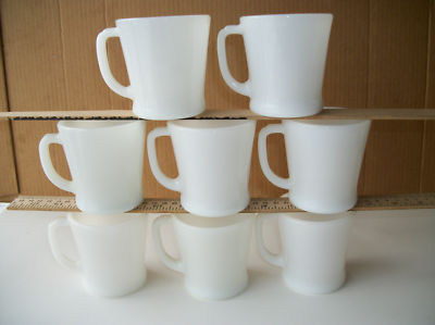 8 Vintage Milk Glass White Fire King Coffee Mugs.