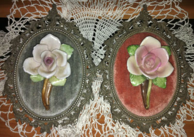 Title (ebay affiliate link): Set of (2) "VINTAGE" Filagree Plaques with Capodimonte Style Flowers on Velvet