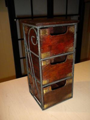 Title (ebay affiliate link): ANTIQUE 3 DRAWER WOOD AND WROUGHT IRON & BRASS RECEIPE BOX - HOLDS 3 X 5 CARDS