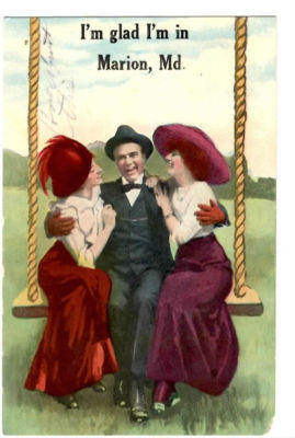 Title (ebay affiliate link): Glad I'm in MARION MARYLAND Greeting Victorian Ladies Man Swing 1913 Postcard