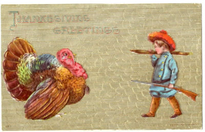Title (ebay affiliate link): Thanksgiving Greetings Turkey Boy Rifle Gold Pattern Background 1909 Postcard