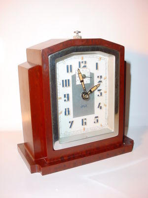 Title (ebay affiliate link): FRENCH ART DECO BAKELITE ALARM MANTEL CLOCK GWO 1931 Signed JAZ "Le FONIC"