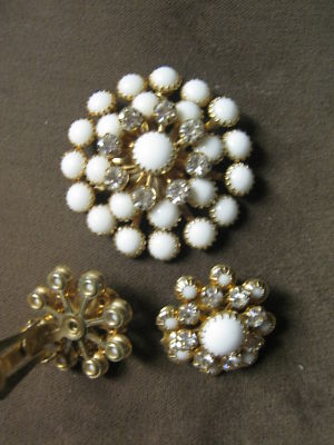 vintage cabochon milk glass/clear rhinestone pin/brooch clip earring set