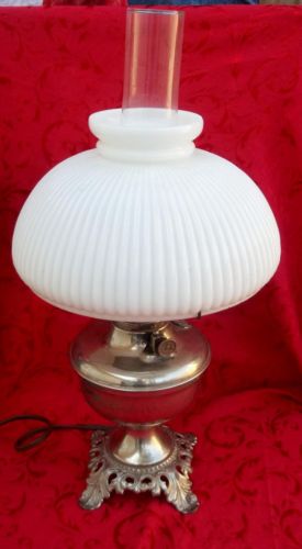 Title (ebay affiliate link): VINTAGE WHITE MILK GLASS & NICKEL SILVER BASE TABLE LAMP ELECTRIC
