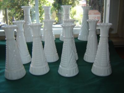 Title (ebay affiliate link): Nice MINT Wedding Event Lot 12 Milk Glass Anchor Hocking Stars & Bars Bud Vases